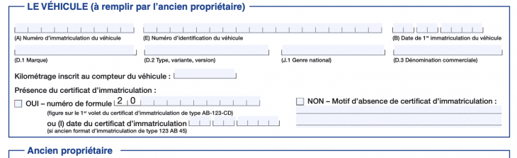 La déclaration de cession d’un véhicule (cerfa n° 15776) établie entre le (ou les) vendeur (s) et le (ou les) acquéreur (s) sans aucune rature.